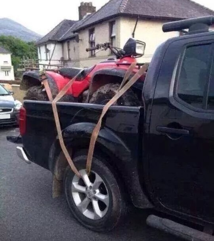 (14) A szomszédom így rögzítette a quadját a terepjáró platójára. Ha nehezen is, de végül sikerült meggyőznöm mielőtt még elindult volna, hogy ez így nem lesz jó.
