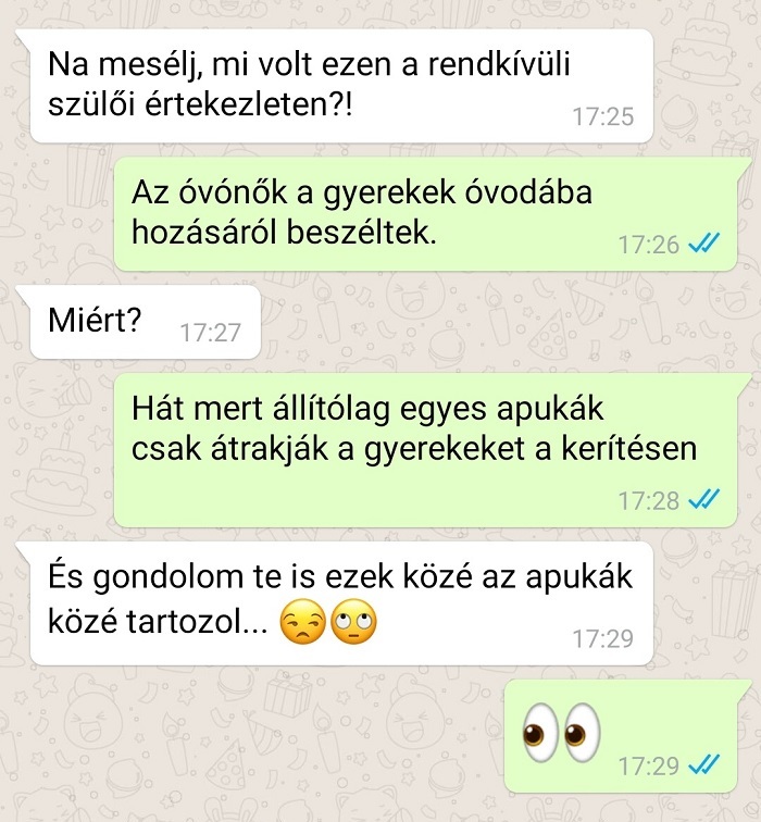 1. Szülői értekezletet tartottak azoknak az apukáknak, akik reggelente óvodába viszik a gyerekeiket.