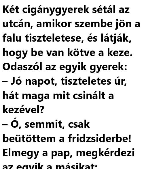 Két cigánygyerek sétál az utcán, amikor szembe jön a falu tiszteletese, és látják, hogy be van kötve a keze. Odaszól az egyik gyerek: