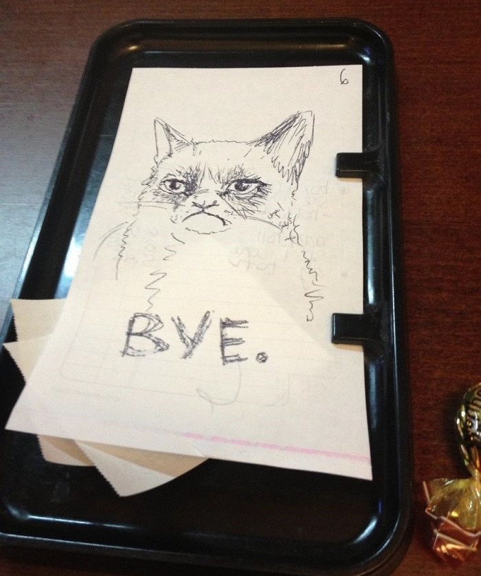 9. Elég mogorva voltam az étteremben, ugyanis nagyon rossz napom volt. Távozáskor a pincérnő egy rajzzal köszönt el tőlem a számla hátoldalán. Ezzel azért sikerült mosolyt csalnia az arcomra.