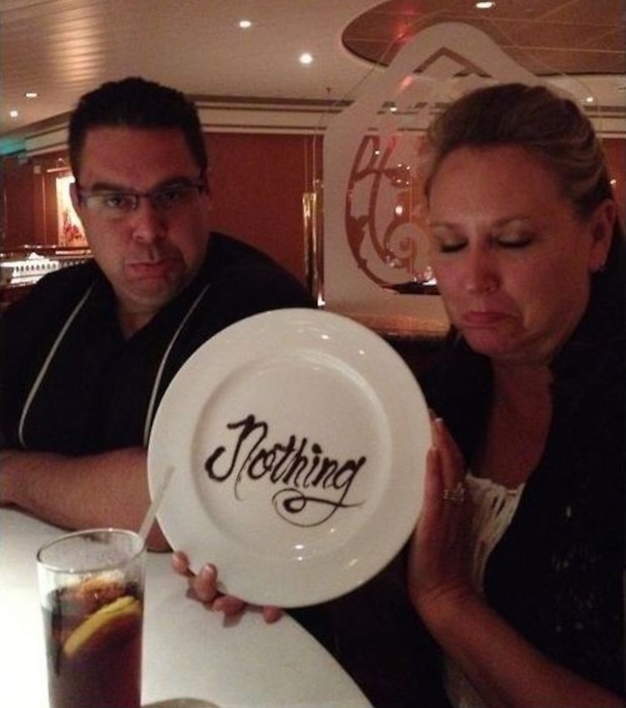 8. A pincér megkérdezte, hogy mit hozhat desszertnek, mire a feleségem azt válaszolta, hogy neki semmit. Így aztán amikor a pincér kihozta az én desszertemet, a feleségemnek is hozott egy tányért, amire csokisziruppal ráírták, hogy „semmi”.
