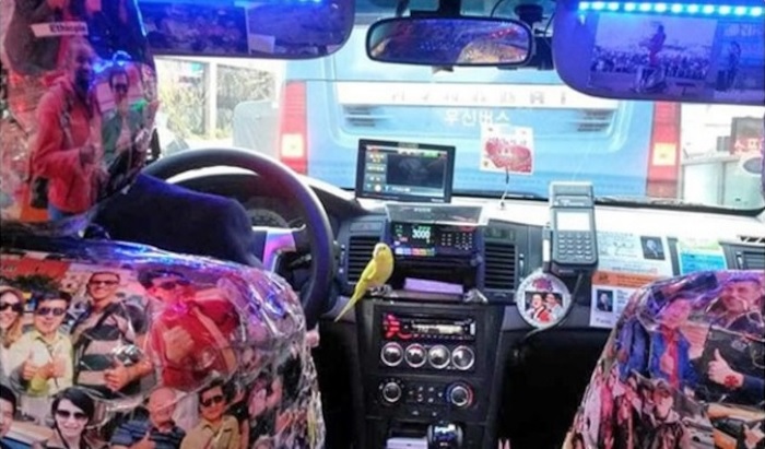 (4) Dél-Koreában beültünk egy taxiba, aminek az üléseit az elégedett utasokról készült fotók borították.